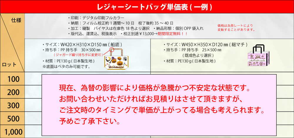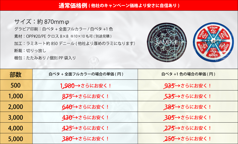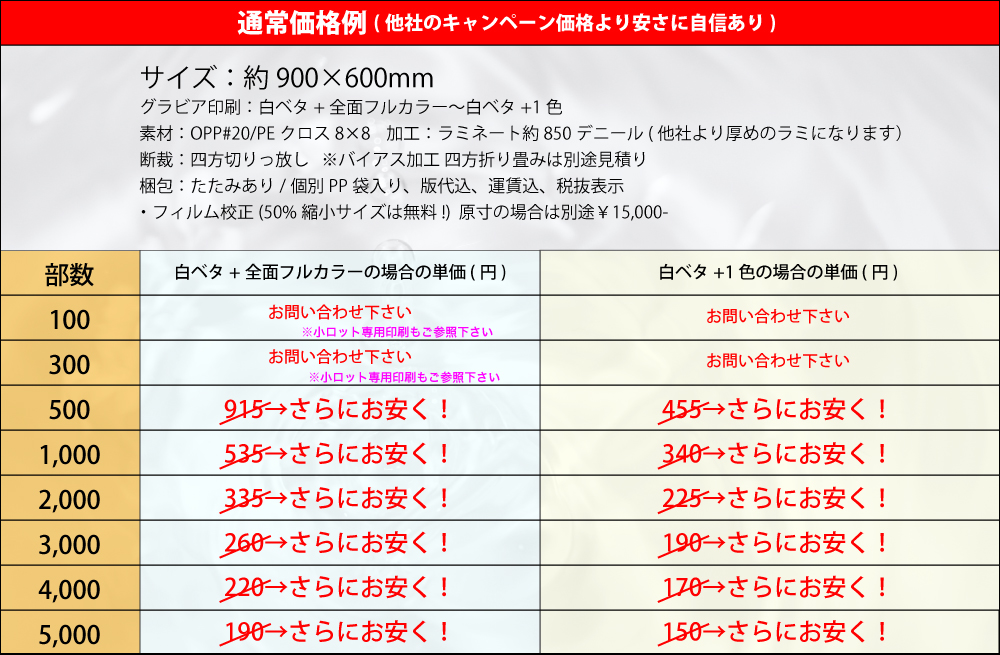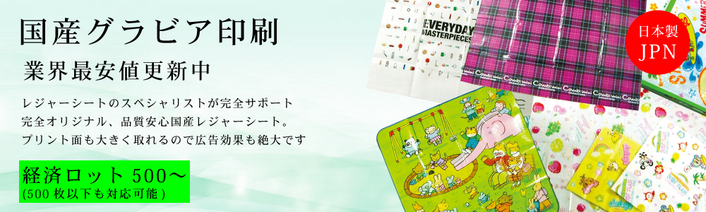 | 納期 | グラビア印刷レジャーシート 約25~30日(日数計算)/1800mm幅→約50日~60日(日数計算) ※ロット数・サイズによって異なりますので 詳しくはお見積り時にお問合せ下さい。 デジタル印刷レジャーシート フィルム校正/約1週間~10日 校了後約40日(日数計算) ※ロット数・サイズによって異なりますので 詳しくはお見積り時にお問合せ下さい。 | 原産 | グラビア印刷レジャーシート 日本 デジタル印刷レジャーシート フィルム調達/日本・印刷加工/海外 |