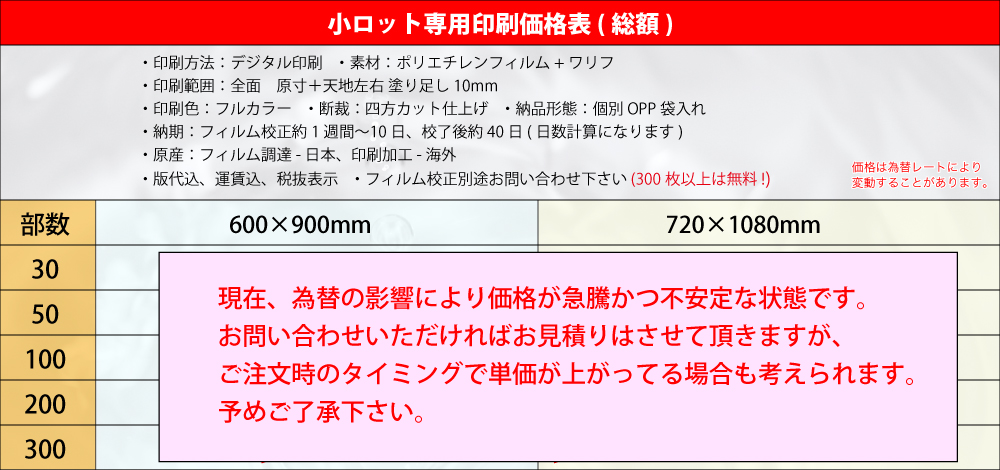 小ロットから大ロット、色数も1色~フルカラー対応(グラビア印刷)できますので案件や予算に応じて製作して頂けます。